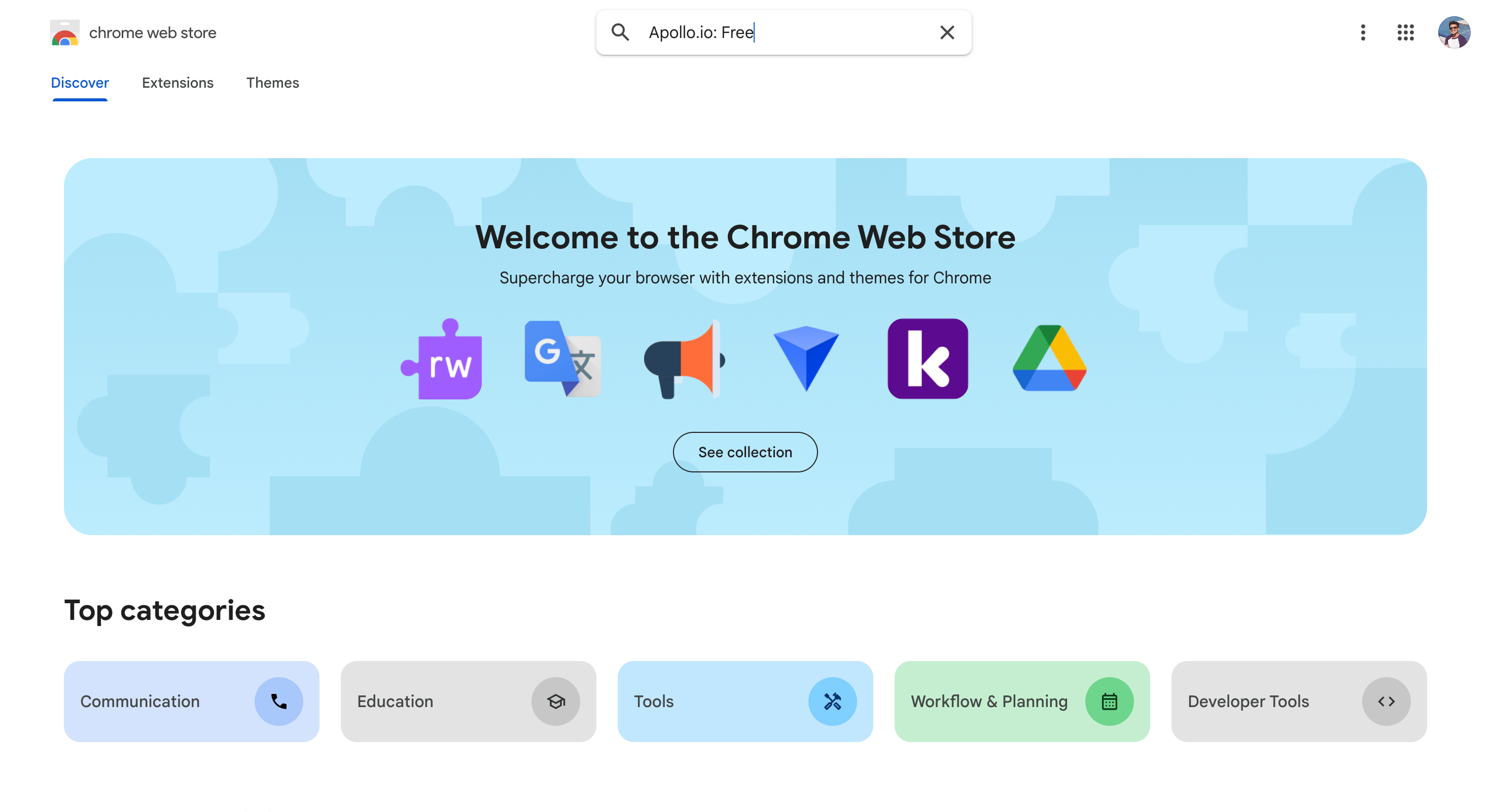 First, open a new tab in your Chrome browser and search for "Apollo Chrome Extension" or navigate directly to the Chrome Web Store and search there.