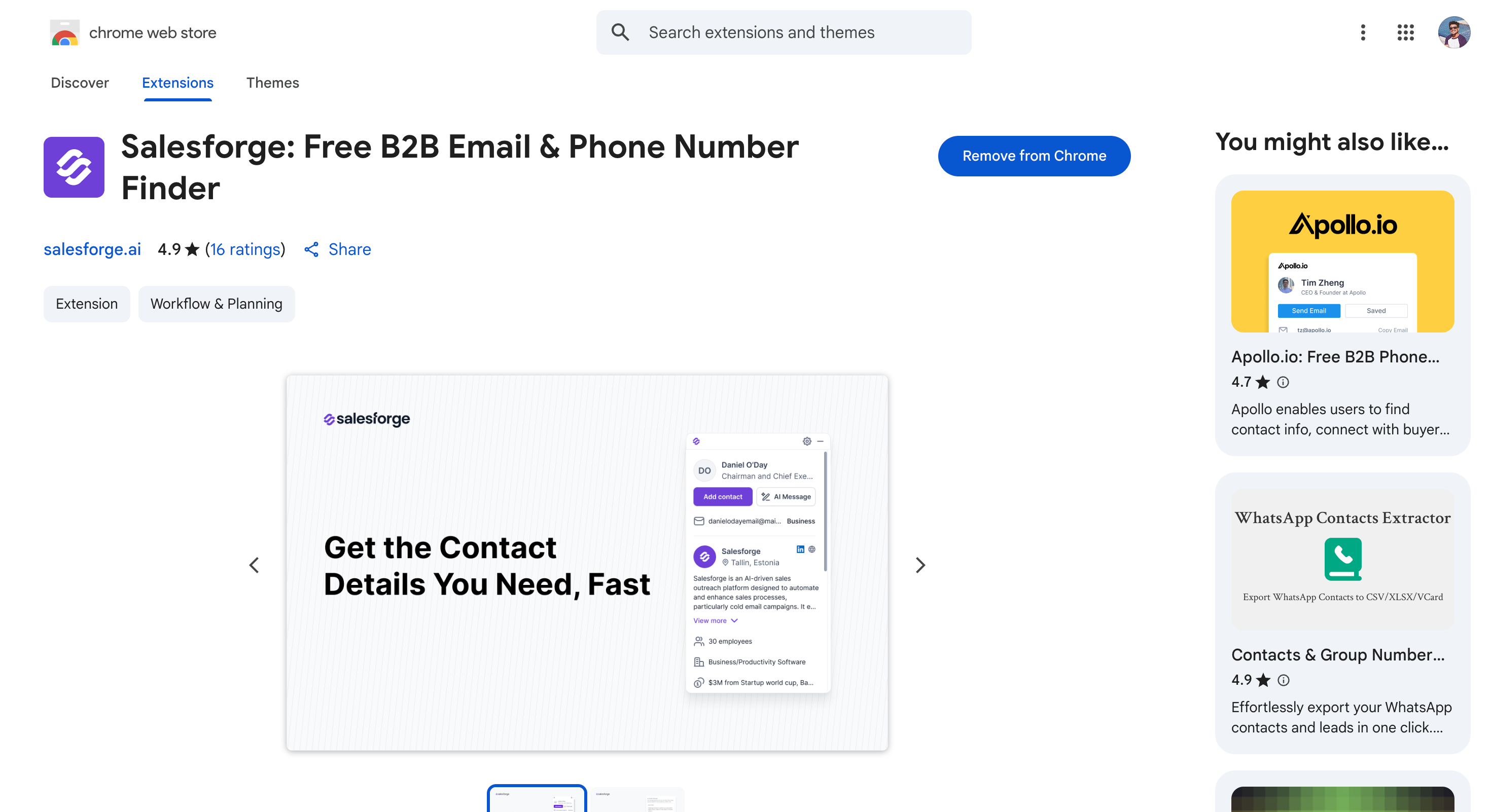 The Salesforge Chrome extension (Free B2B Email & Phone Number Finder) maintains a perfect 4.9/5 rating, while Apollo has 4.7/5 rating.